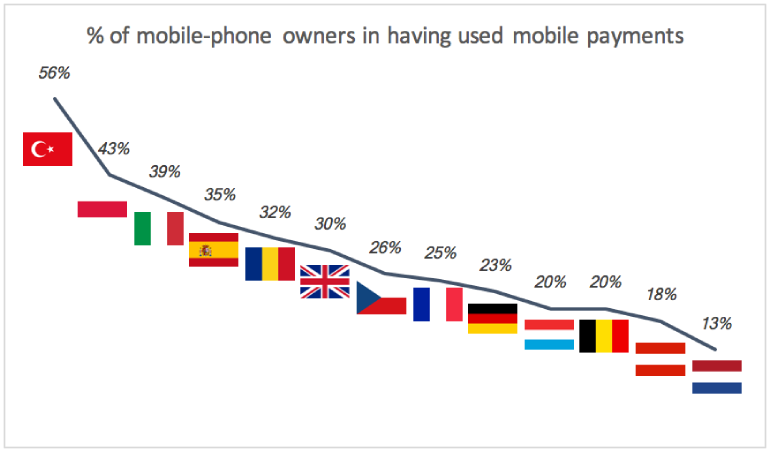 Aside from “how many” people use payment services in Turkey, “how” many people use payment services is changing as well. Often, emerging countries skip one infrastructure step of developed countries to head-start the next big technology early. This is certainly true for internet and mobile technology. While North America and Europe were much faster to build landline internet infrastructure, countries such as India, Philippines and Turkey, spear-head the global transition into a mobile & digital world. While mobile banking, mobile payments and technological innovation is perceived with skepticism especially amongst societies of Western Europe, Turkey could not be further away from their neighbors’ sluggishness.